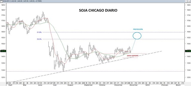 En efecto, actualmente la soja chicago tiene soporte en la zona de 1420-1380 centavos. Mientras esta zona no sea quebrada, resulta posible desde esas instancias el avance quede retomado, en camino de llevar los precios por encima de los 1480 centavos, con proyección en la zona de 1530-1600 centavos.