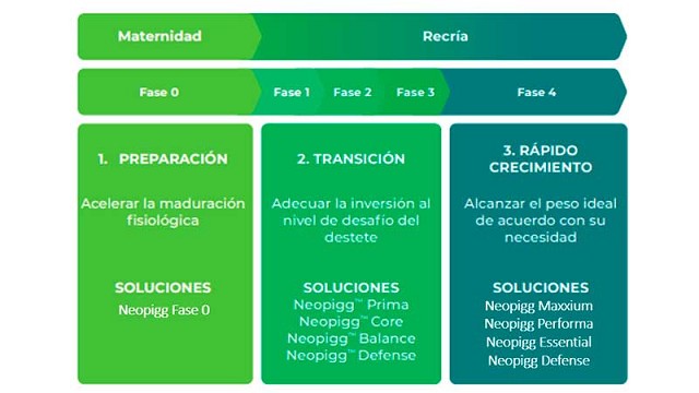 En la Transición se busca promover una adecuada adaptación de los lechones a la fase de recría, para que tengan un excelente desempeño en la fase de rápido crecimiento. Para ello Neopigg ofrece TechPig, una herramienta de decisión que estima el nivel de desafío de la granja, tomando en cuenta la edad, peso al destete, maduración fisiológica y salud de los animales. Las líneas de productos para esta etapa también están diseñadas para atender a los diferentes niveles de desafío, garantizando que los ingredientes y formulaciones sean los más adecuados, incluyendo aditivos que promueven la salud intestinal y fortalecen el sistema inmune. Los principales beneficios que se obtienen son: alto consumo de ración desde los primeros días; rápida adaptación y maduración fisiológica; equilibrio de la flora intestinal con menores riesgos de diarreas; desempeño, uniformidad y salud de los lechones; una inversión adecuada para atender las necesidades del animal, sin gastar más de lo necesario.