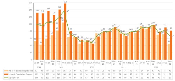 El último Índice Ag Barometer de noviembre 2022, elaborado por el Centro de Agronegocios y Alimentos de la Universidad, revela una importante caída con relación a la medición de septiembre pasado y se ubica entre los más bajos desde que comenzó la medición hace 4 años.