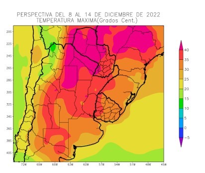 Al comienzo de la perspectiva, continuarán soplando vientos del trópico, acentuando el ascenso térmico, con temperaturas máximas superiores a lo normal en el norte y centro del área agrícola, mientras el sur y el litoral atlántico recibirán vientos marinos, que moderarán los registros térmicos. Paralelamente, se producirá el paso de un frente de tormenta, produciendo lluvias en la mayor parte del área agrícola, salvo gran parte del Paraguay y el sudoeste de la Región Pampeana. Junto con el paso de frente, se producirá la entrada de vientos polares, provocando el descenso de la temperatura durante un corto lapso, luego del cual retornarán los vientos del trópico reactivando el calor.