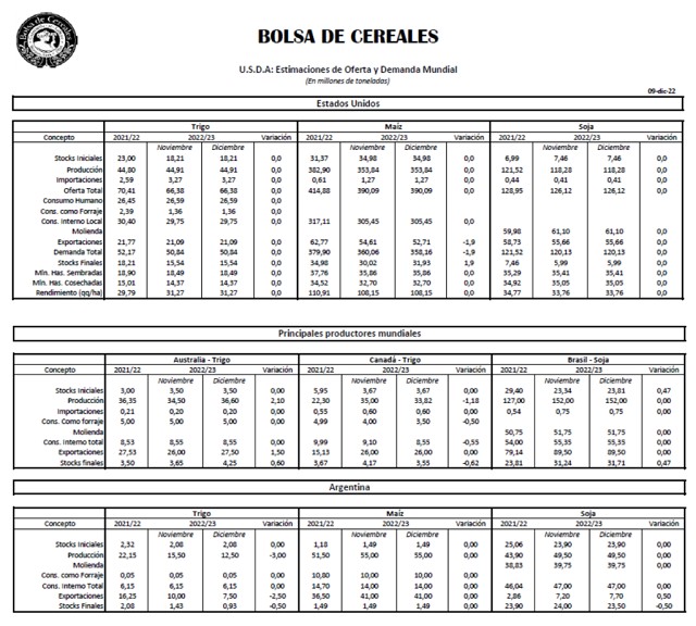Maíz, en este caso el informe fue definitivamente neutro. Se puede ver claramente que los números reflejan pequeñas variaciones respecto al anterior, tanto en exportaciones y demanda total como en stock finales para Estados Unidos mientras que para Argentina los números son los mismos que en el de octubre/22.Soja para la oleaginosa, en el país del norte fue absolutamente neutro, no mostrando variación alguna. En Brasil solo una pequeña variación en los stocks iniciales y finales, y en Argentina, producto de un pequeño aumento en las exportaciones se muestran reducciones en los stocks finales.