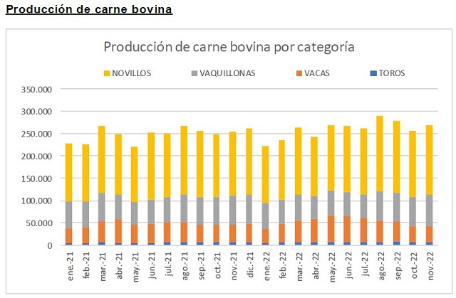 La producción de carne bovina del mes de noviembre de 2022 alcanzó las 269,2 mil toneladas res con hueso incrementándose en 13,9 mil toneladas con respecto al mes anterior, y también incrementándose en 15,3 mil toneladas con respecto al mes de noviembre del año pasado. En los primeros 11 meses del año 2022, la producción de carne bovina alcanzó los 2,85 millones de toneladas equivalente res con hueso; situándose 132 mil toneladas por encima del acumulado del período enero a noviembre de 2021, que había ascendido a 2,72 millones de toneladas equivalente res con hueso.