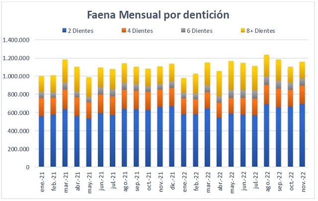 En los primeros once meses del año 2022, se faenaron 12,26 millones de bovinos; un (+3,6%) que los 11,83 millones que se habían faenado entre enero y noviembre de 2021. El mayor aporte al incremento de la faena proviene de las hembras de 8 y más dientes, que superaron en 310 mil cabezas la faena acumulada en los primeros once meses del año pasado. En sentido contrario, las categorías que muestran los mayores recortes en la comparación interanual han sido los novillitos de 4 dientes (-99 mil), las vaquillonas de 4 dientes (-73 mil), y las vacas de 6 dientes (-110 mil).