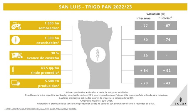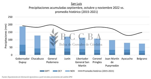 En el trimestre de septiembre a noviembre 2022 las precipitaciones fueron menores al promedio histórico en toda la provincia de San Luis. Esto trajo como consecuencia estrés hídrico durante las etapas reproductivas del poco trigo que se sembró en secano y, de no modificarse la situación en los próximos meses, dificultaría el desarrollo de los cultivos estivales.