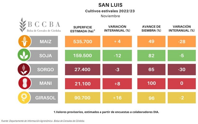 Para la campaña 2022/23 se espera en la provincia de San Luis un leve crecimiento en el área del maíz y una caída del 12 % en la superficie de soja. La estabilidad del maíz ante ciertas adversidades explica el incremento en el área del cereal, mientras que la oleaginosa se vería reemplazada tanto por el maíz como por el girasol, cultivo que vería aumentada su superficie en un 16 %.