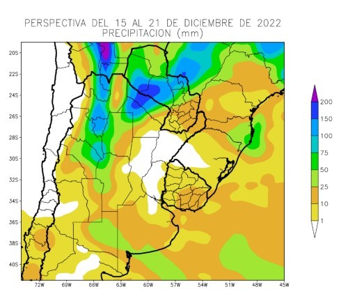 La perspectiva comenzará con lluvias abundantes, con riesgo de tormentas severas sobre todo el oeste, el centro norte y el sudeste del área agrícola, mientras que una gran extensión en el centro-este recibirá registros escasos. Junto con las lluvias, se producirá la entrada de vientos polares, produciendo un marcado descenso térmico, con riesgo de heladas en el sudeste bonaerense. El proceso finalizará con el retorno de los vientos del trópico, produciendo un ascenso térmico, superando los registros normales para la época en partes del norte y el centro del área agrícola, mientras el sur y el litoral atlántico recibirán vientos marinos que moderarán los registros.