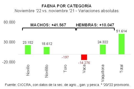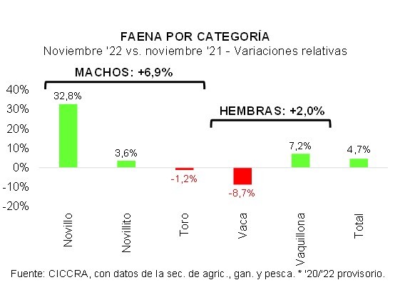 En enero-noviembre de 2022 se faenó un total de 12,3 millones de animales vacunos, es decir 3,5% más que en los primeros once meses del año pasado. La faena de machos totalizó 6,73 millones de cabezas y se ubicó 2,6% por encima de la realizada en enero-noviembre del año pasado (+170,7 mil cabezas). La faena de novillos explicó casi todo el crecimiento interanual de la faena de machos (94,8%), producto de una suba de 18,0% anual. En cambio, la faena de novillitos disminuyó 0,2% interanual y la de toros subió 9,9% anual, si bien su importancia en el total es marginal.