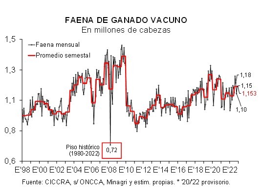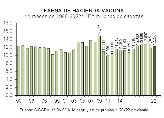 En enero-noviembre de 2022 se faenó un total de 12,3 millones de animales vacunos, es decir 3,5% más que en los primeros once meses del año pasado (+418,3 mil cabezas). No obstante el incremento de la faena observado en los últimos cuatro meses, cuando se pone en la perspectiva de los últimos cuarenta y tres años, la faena de los primeros once meses de 2022 se ubicó en el puesto Nº 16 y resultó sólo 3,4% mayor al promedio de los enero-noviembre de 1980-2021.