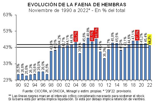 En lo que transcurrió del año se faenaron 5,54 millones de hembras, es decir 4,7% más que un año antes (+247,6 mil cabezas). Fue la faena de vacas la que explicó casi todo el incremento interanual (91,1%), producto de la baja base de comparación que provocó la restricción impuesta por el gobierno nacional para exportar de cortes de vaca a China entre mayo y agosto de 2021, media que luego fue morigerada de manera parcial (cuotificación). Por su parte, la faena de vaquillonas subió apenas 0,7% interanual. Con estos guarismos, la participación de las hembras en el total subió a 45,1% (+0,5 puntos porcentuales).