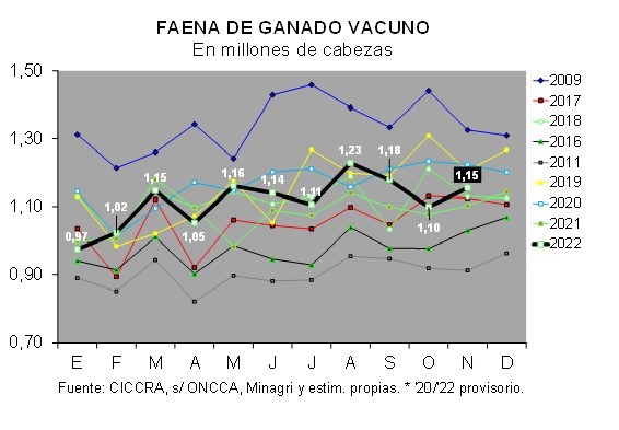 En enero-noviembre de 2022 la industria frigorífica argentina produjo 2,85 millones de tn r/c/h de carne vacuna. Estimando que el volumen exportado ascendió a 819,4 mil tn r/c/h en los primeros once meses del año, es decir que se incrementó 11,0% anual, el volumen de carne vacuna enviado al mercado interno habría totalizado 2,03 millones de tn r/c/h, lo que implica un incremento de 2,5% anual (+50,5 mil tn r/c/h).