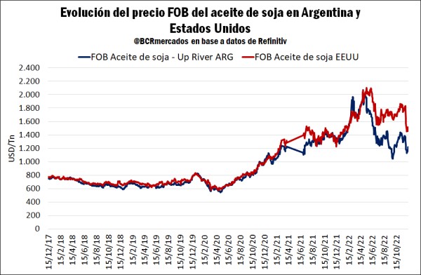 En un contexto de amplias expectativas de incremento del mandato, luego de la publicación del informe los precios cayeron US$ 150/t el primer día de diciembre, la mayor baja nominal y la décima baja relativa más importante desde que el aceite de soja cotiza en Chicago, superior a un 9%. Aun así, los precios del aceite persisten en Chicago un 18% por encima de las cotizaciones al inicio del 2022.