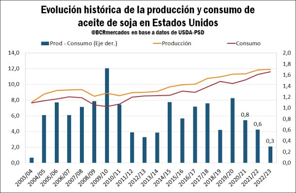 Si se hace foco en la evolución histórica de la producción de aceite de soja, íntimamente relacionada a la trayectoria del crush local, en la última década la producción de aceite aumentó 32,7%. Mientras que, la demanda interna de dicho subproducto avanzó en un 36,5% con especial énfasis en los últimos años. Tal como se puede observar en el siguiente gráfico, desde el ciclo 2020/21 comenzó a reducirse fuertemente la diferencia entre producción y consumo, alcanzando un mínimo desde la campaña 2003/2004 la proyección del último año.