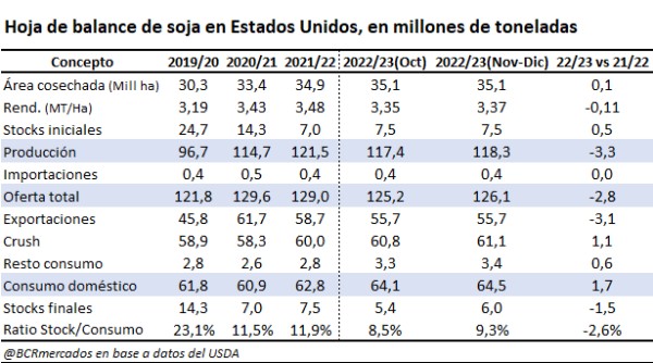 Respecto a la situación de la hoja de balance de soja, en el último informe de producción de cultivos de noviembre se aumentó la proyección de producción de soja hasta 118,3 millones de toneladas, un 1 por ciento por encima de la estimación previa aunque 8% por debajo del año 2021. Sin cambios en el área cosechada, la mejora de los rendimientos en Iowa, Missouri, Nebraska y North Dakota contribuyeron a mejorar las estimaciones productivas.