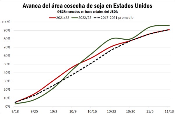 La cosecha de soja estadounidense 2022/23 ya se dio por finalizada a finales de noviembre, con el último registro de condición de los cultivos mostrando un 57 % del área en estado bueno a excelente (vs. 59 % el año previo a igual período). Si bien se comenzó lentamente con la cosecha de la oleaginosa, hacia principios de octubre el clima favorable ha contribuido para un rápido avance que permitió finalizar con mayor rapidez que el año pasado y por encima del promedio de los últimos cinco años.