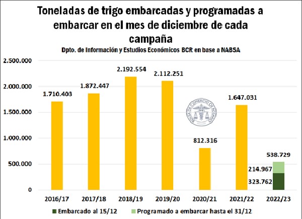 Esta situación que ocurre con la logística terrestre se replica en el transporte marítimo del cereal. Tomando los buques de trigo despachados entre el 1° y el 15 de diciembre y lo programado a embarcar hasta el 31 de dicho mes, se estima que se despacharán al exterior 0,54 Mt del cereal, un 66% menos del volumen despachado en todo diciembre de 2021 (1,6 Mt). Este menor volumen despachado con respecto a años anteriores responde, obviamente, a la limitada producción consecuencia de la terrible sequía que azota a nuestro país. Además, en comparación con años anteriores, el volumen que se despacharía en el mes que corre sería inferior al que se embarcó en diciembre de 2020, como muestra la siguiente imagen.