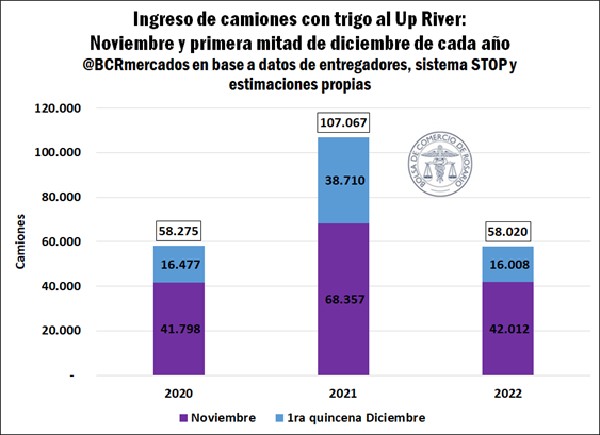 Frente a este panorama productivo, y luego de haber pasado octubre y noviembre con un acotado ritmo en el arribo de camiones a las terminales portuarias de la región, es notoria la diferencia con lo que acontecía hace un año, cuando la alta producción triguera de la región centro y norte del país dejó como saldo una fuerte suba en el ingreso de camiones ese mes (38.710 unidades en diciembre de 2021, frente a 16.008 ingresadas este año, siempre tomando el dato de posición de camiones a las 6 am).