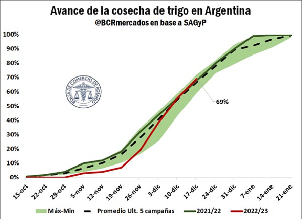 En el siguiente gráfico se observa el avance porcentual de la cosecha de trigo argentina, y la comparativa respecto al promedio de los últimos cinco años. Si bien la producción en la actual campaña alcanzará un mínimo desde el ciclo 2015/16, el avance de la cosecha se mantiene en línea respecto de lo ocurrido en años anteriores (ya se recolectó el 69% del área, 2% por encima del promedio de los últimos cinco ciclos y 1% por encima que en la campaña 2021/22).