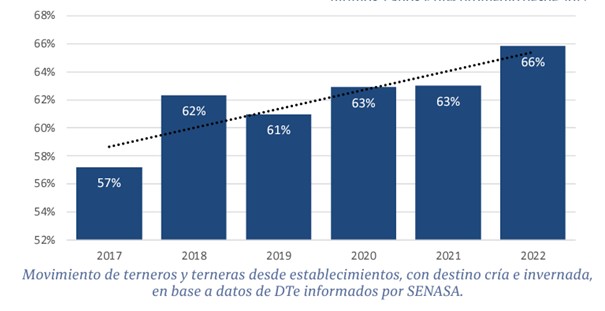 De acuerdo a los datos de movimientos de hacienda informados por SENASA, hasta el mes de noviembre se registraron más de 9,52 millones de terneros y terneras saliendo de los campos, unos 500 mil terneros más que los trasladados en igual período del año pasado. Medido sobre el stock inicial de la categoría -nacimientos 2021- la cifra representa un 66% contra 63% registrado en los últimos 2 años y 61% promedio desde 2017.