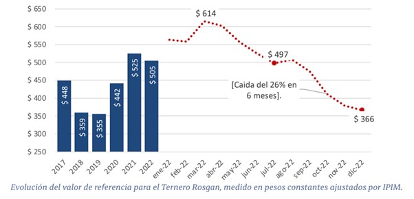 Medido en pesos constantes, ajustados por IPIM, el valor del Ternero ROSGAN, cierra el año en un promedio de $505 que comparado contra el promedio de 2021 ($525) representa apenas una 4% menos, siendo aún el segundo valor más alto de los últimos 5 años. Sin embargo, en la apertura mensual, se observa un claro deterioro de los valores a lo largo del año desde los máximos alcanzados en abril ($614, medidos a valores hoy) que se termina profundizando en los últimos meses a causa de la seca. La referencia diciembre para el Ternero ROSGAN se ubica en $366, marcando una caída del 26% en términos reales, en la segunda mitad del año.