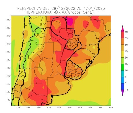 • El este del NOA, el este de Cuyo, el sur de la Región del Chaco, el sudeste del Paraguay, el norte de la Mesopotamia, la mayor parte de la Región Pampeana y gran parte del Uruguay observarán temperaturas máximas superiores a 30°C, con varios focos con valores superiores a 35°C, que se ubicarán sobre la mayor parte del Paraguay, gran parte de la Región del Chaco, la mayor parte de la Mesopotamia y el sudoeste de la Región Pampeana y otros focos con valores inferiores.