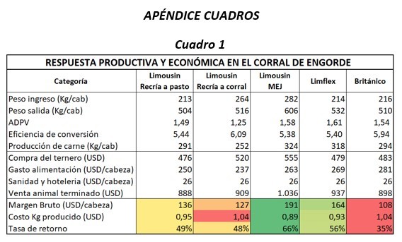 Los Limousin MEJ obtuvieron el mejor resultado económico, considerando el margen bruto mayor (191 USD/cabeza), el costo del kilo producido más bajo (USD0,89) y la tasa de retorno más elevada (66%). En 2° lugar, fue para los Limflex, 3° quedaron los Limousin castrados (recriados a pasto y a corral) y 4°, los británicos, con el menor margen bruto (USD108/cabeza), el mayor costo del kilo producido (U$S 1,04) y la menor tasa de retorno (35%) (Ver cuadro 1, en Apéndice).