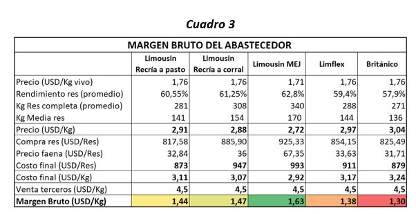 Según el diseño del Ing. Agr. Osvaldo Luna, para determinar el rendimiento y el peso de la res logrado por el matarife, se tomó el valor promedio de ambas faenas del ensayo. Las 3 categorías de Limousin fueron las mejores alternativas para el abastecedor (MEJ, USD1,63/kg; recría a corral, USD1,47/kg, y recría a pasto, USD 1,44 kg), permitiéndole comprar tropas de mejor rinde y obtener más kilos de carne por res, seguidos por los Limflex (USD1,38/kg) y los británicos (USD1,30/kg). (Ver cuadro 3, en Apéndice).