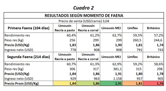 El orden de mayor a menor rinde de cada tropa se mantuvo en ambas instancias de faena (104 y 214 días). Para los Limousin MEJ, la variación fue prácticamente nula (62,7/62,9%), siendo la categoría que más rindió. Le siguieron los Limousin recriados a corral (61,2/61,3%), los Limousin recriados a pasto (60,7/60,4%), los Limflex (59,5/59,2%) y los británicos (57,2/58,6%). Teniendo en cuenta el precio de venta de la carne (USD3,04) y el rendimiento al gancho de cada tropa, se llegó al precio promedio de los animales: el mayor para los Limousin MEJ (USD/kg 1,91/kg) y el menor para los británicos (USD/kg 1,76). (Ver Cuadro 2, en Apéndice).