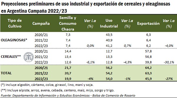 De esta manera, frente a la relativa estabilidad del uso industrial, la disminución en la producción hace prever una caída del 27% en la exportación de granos. Para el ciclo comercial 2022/23 se proyectan envíos al exterior de granos cereales y oleaginosas por un total de 45,9 millones de toneladas, el volumen más bajo desde la campaña 2017/18 cuando se exportaron 43 millones de toneladas, en medio de otra brutal sequía.