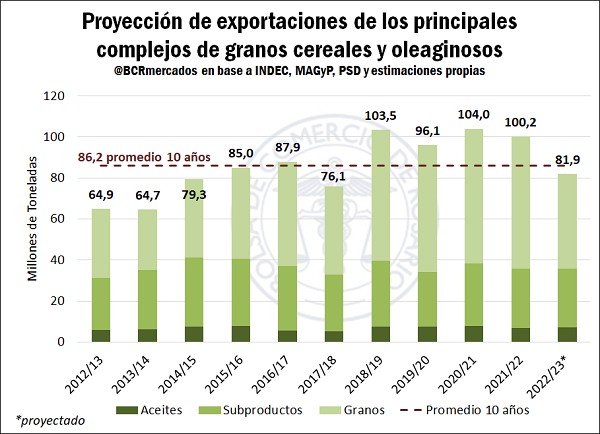 Así las cosas, se espera que el complejo agroindustrial en su conjunto finalice la campaña 2022/23 con un total de exportaciones entorno a las 82 Mt que, si bien constituye una importante disminución respecto al ciclo anterior, se ubica en torno al promedio de los últimos 10 años.