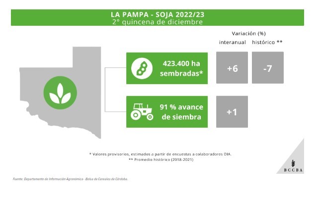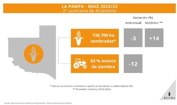 Para la campaña en curso se estima que se sembrarán 739 mil ha con maíz en la provincia de La Pampa, de las cuales 614 mil ya se encontrarían en pie, representando un 83 % del área. Se calcula que alrededor de un 20 % se sembró en fechas tempranas mientras que el restante 80 % de los productores optó por sembrar después del 1 de noviembre.