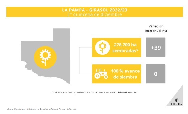 En cuanto al girasol, se calcula que se encuentran en pie las 277 mil ha estimadas, transitando a la fecha los últimos estadios vegetativos y/o empezando los reproductivos. Los lotes presentan mayormente condiciones excelentes a buenas y casi un 30 % regulares a malas debido a las condiciones climáticas predominantes: falta de agua y altas temperaturas. Los técnicos referentes distribuidos por la provincia no han reportado aún factores sanitarios que estén afectando al cultivo.