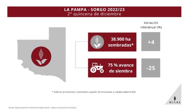 A la fecha se prevé que el 75 % de los lotes programados con sorgo ya se encuentran con la labor de siembra finalizada, mientras que el 25 % restante está a la espera de mejores condiciones climáticas. En total, se estima un área de 39 mil ha.