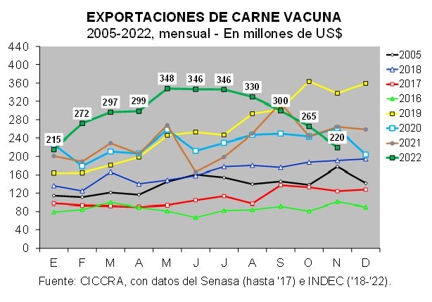El total facturado por exportaciones de carne vacuna fue de 219,6 millones de dólares en noviembre de 2022. En relación a octubre se observó una baja de 17,3% (-45,8 millones de dólares) y en relación a noviembre de 2021 la caída fue de 16,9% (-44,7 millones de dólares).