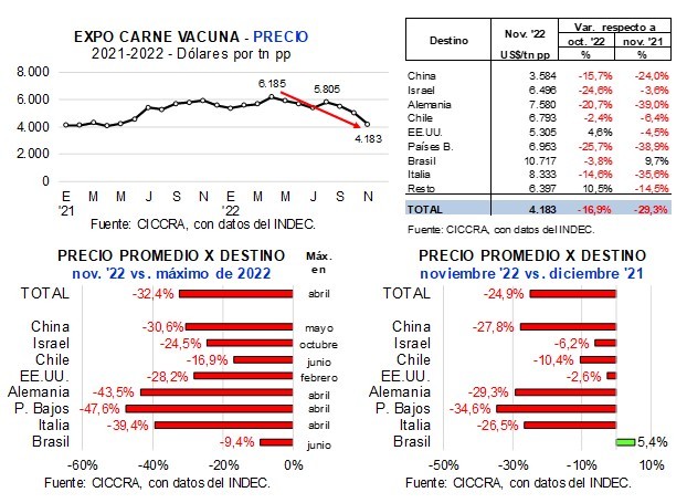 Las ventas a China se hicieron a un valor promedio de 3.589 dólares por tn pp en noviembre de 2022. Esto implicó una baja de 15,6% mensual y una caída de 30,6% con relación al pico de mayo pasado. Y en el caso de las exportaciones a Europa, el precio promedio descendió ya más de 40,0% en relación al pico de abril. La mayor baja se observó en los envíos a Países Bajos (-47,6%), seguida por la de las venta a Alemania (-43,5%) e Italia (-39,4%). Detrás quedaron las bajas de precios de las ventas a EE.UU. (-28,2% vs. febrero ’22), Israel (-24,5% vs. octubre ’22) y Chile (-16,9% vs. junio ’22).