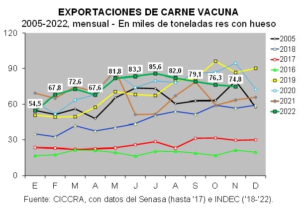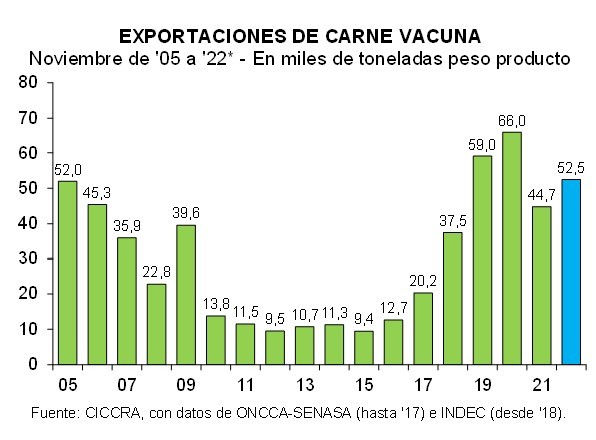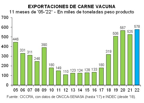 En tanto, en los primeros once meses de 2022, la industria frigorífica argentina exportó 825 mil tn r/c/h de carne vacuna. En la comparación con enero-noviembre de 2021 todavía se registró una suba de 10,1%.