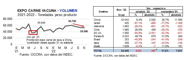 En noviembre de 2022 se exportaron 52,5 mil toneladas peso producto (tn pp) de carne vacuna (74,8 mil tn res con hueso (tn r/c/h)), es decir 0,6% menos que en octubre (-347 tn pp). Al igual que en el mes previo, los envíos descendieron de forma significativa a Israel (-67,1%; -866 tn pp), a lo que se sumaron retrocesos en las ventas a Alemania (-28,4%; -661 tn pp) y a EE.UU. (-65,9%; -2,0 mil tn pp). Aunque de menor importancia cuantitativa, también se observaron caídas en los envíos a Brasil e Italia. Pero, los mayores embarques a China (+6,4%; +2,6 mil tn pp), Chile (+26,0%; +409 tn pp) y Países Bajos (+49,7%; +678 tn pp), compensaron en gran medida las bajas referidas.