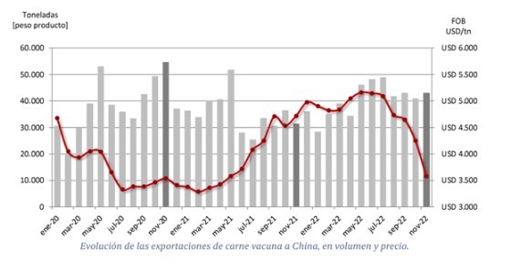 Durante los primeros ocho meses del año, los precios de exportación para la carne vacuna resultaron superiores a los registrados en 2021, año en que los valores ya registraban marcas récord. En abril, el precio promedio de la tonelada exportada marcaba un nuevo récord de USD 6.300, un 55% superior al registrado un año atrás. A partir del segundo trimestre, el escenario comenzó a tornarse complejo para la exportación, especialmente por la debilidad que comenzaba a acusar la demanda europea y a la que posteriormente se sumara China, aun inmersa en la lucha por controlar el Covid con medidas extremadamente estrictas que ocasionaron una fuerte desaceleración de su economía.
