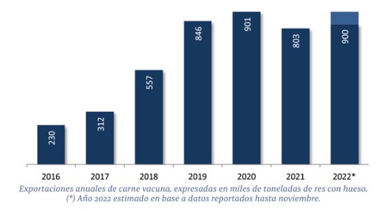 En los primeros once meses del año, las exportaciones de carne vacuna suman 828 mil toneladas, un 12% más que lo registrado en igual período de 2021. De sostenerse este ritmo de embarques, se estima arribar a f in de diciembre con un volumen cercano a las 900 mil toneladas equivalentes, similar al conseguido en el año 2020, previo a la imposición de las restricciones.