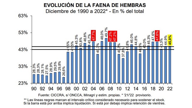 La faena de hembras representó 45,0% de la faena total en diciembre del año pasado. Fue el ratio más elevado de los últimos tres diciembres, pero todavía se mantuvo en el límite superior del intervalo consistente con el sostenimiento del rodeo vacuno y resultó similar al promedio de los diciembres de los últimos veinticinco años.