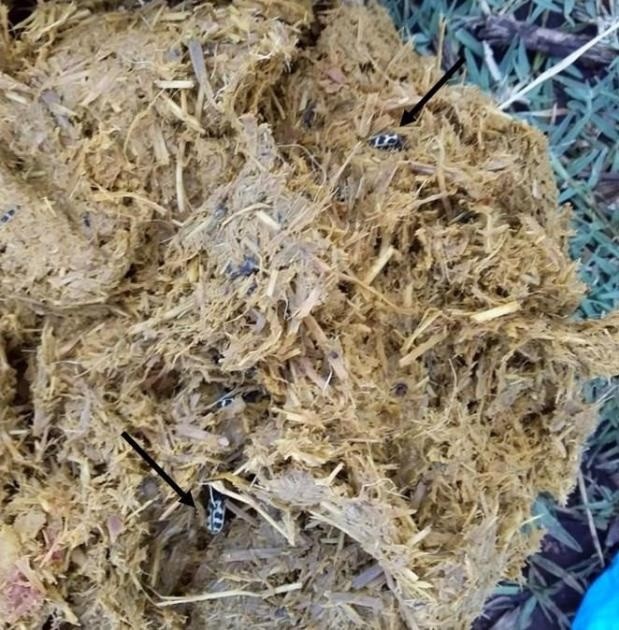 Los animales presentaron un cuadro de diarrea, de los que murieron 15 ejemplares. En las necropsias realizadas se constató la presencia del escarabajo en el contenido ruminal, enrojecimiento en intestino delgado y contenido intestinal líquido de color rojizo.
