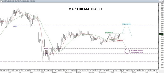 El cereal recupera posiciones y los precios enfrentan resistencia en 685-688 centavos. Subidas por encima de esta zona, resultan necesarias para validar un camino de alza mayor, con proyección en la zona de 720-730 centavos, para recién desde allí revertir a la baja. Mientras tanto, la zona de 660-650 centavos es soporte ante recortes eventuales. Sólo con caídas debajo de esta zona, estaremos cancelando las expectativas de recuperación mayor y en tal caso el cereal quedará vulnerable a bajas mayores, al menos con destino de 620-595 centavos.