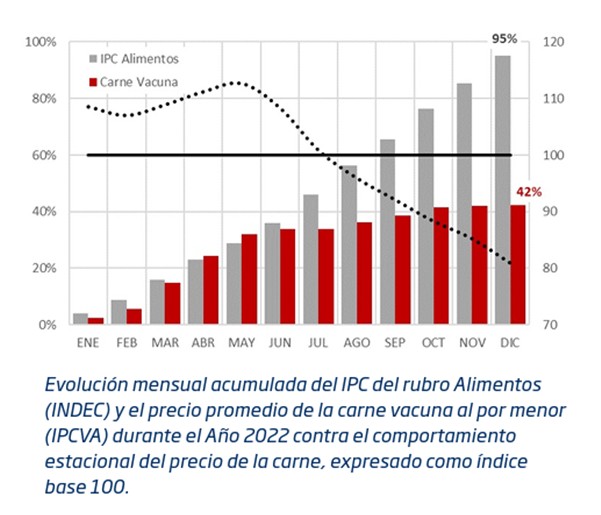 Sin embargo, durante el año pasado este patrón se vio fuertemente alterado. Recordemos que el precio de la carne al mostrador cerró el 2022 sumamente atrasado respecto del incremento general registrado en los precios de los alimentos (42% vs 95%), habiendo permanecido prácticamente estancado durante todo el segundo semestre.