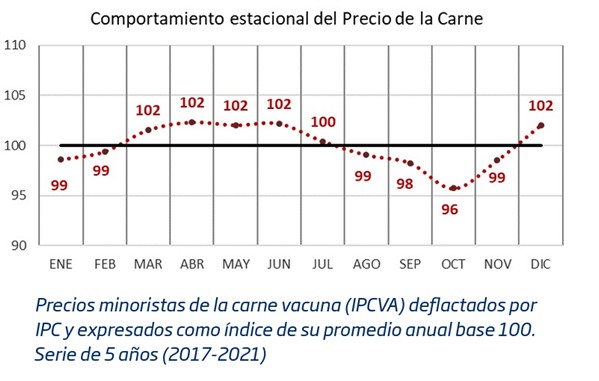 Por su parte, el precio de la carne presenta una estacionalidad muy similar. Los grandes ajustes del precio de la carne a nivel local suelen darse a partir de marzo con el inicio de las clases y el regreso de las familias a su rutina habitual. Estos valores en general se sostienen por sobre el promedio durante todo el primer semestre mientras que, a partir de septiembre es habitual ver ciertos retrasos que luego terminan corrigiendo con nuevas actualizaciones hacia fin de año.