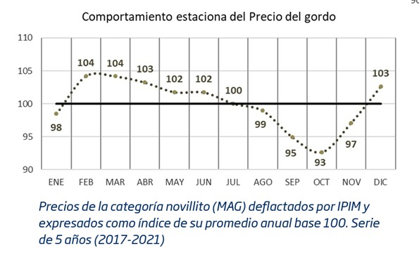 En efecto, si analizamos la evolución del precio del gordo en los últimos años vemos una estacionalidad muy marcada. Tomando los valores promedio para la categoría Novillito del Mercado Agroganadero de Cañuelas (MAG), deflactados por inflación mayorista (IPIM) y expresados como índices de su promedio anual (con base igual a 100), vemos que a partir de febrero y hasta mitad de año, los valores del gordo tienden a sostenerse por sobre su promedio anual. A partir del segundo semestre, por el contrario, comienzan a perder terreno hasta el próximo momento de corrección, que usualmente se produce hacia fin de año.