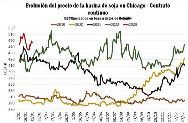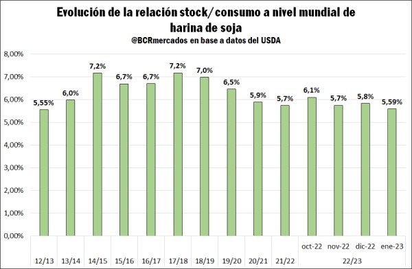Respecto a la situación mundial de producción y consumo de harina de soja, en noviembre el USDA empezó a quitar optimismo a la hoja de balance con ajustes a la baja en la producción y un aumento en el consumo mundial, lo cual hizo cambiar la tendencia de la ratio stock/consumo a la baja, momento en el cual los precios comenzaron su rally alcista. En la última revisión de enero, el USDA ajustó la producción de soja en Argentina por la sequía, afectando también su crush del ciclo 2022/23.