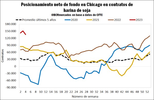 En cuanto al posicionamiento de los fondos en contratos de futuros y opciones de harina de soja en Chicago, muestra que fueron importantes impulsores de las cotizaciones con 8 semanas consecutivas aumentando el posicionamiento neto comprado desde finales de noviembre. No obstante, la semana que finalizó el 24 de enero cayó el posicionamiento neto comprado hasta 135.503 contratos desde un máximo histórico de 150.939 contratos. Es decir, habrá que estar atentos las próximas semanas respecto a cómo continúa la posición de los fondos, ya que podrían impulsar bajas en el mercado de harina y arrastrar parcialmente a la soja.