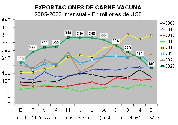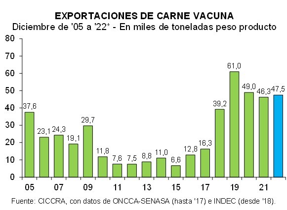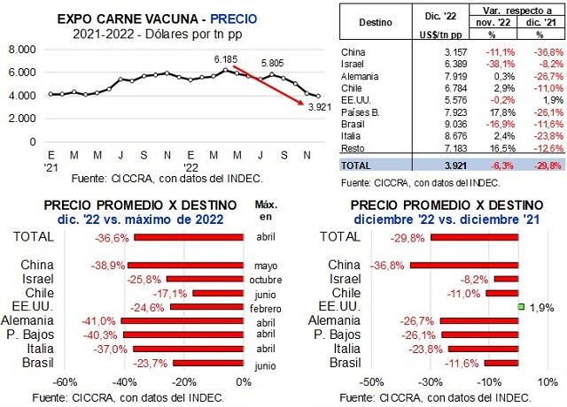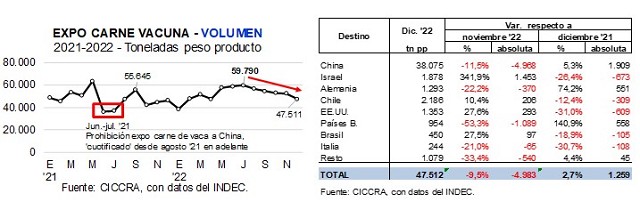 En la comparación interanual el mayor volumen exportado de carne vacuna (+2,7%; +1,26 mil tn pp) se explicó por la recuperación de los envíos a China (+5,3%; +1,9 mil tn pp). En total, en diciembre de 2022 se exportaron 47,5 mil tn pp de carne vacuna, de las cuales 38,1 mil se destinaron al gigante asiático (80,1% del total).