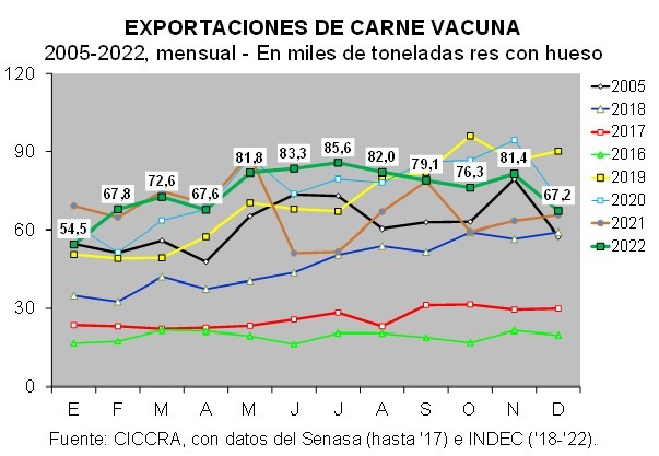 Diciembre de 2022 finalizó con certificaciones por 47,5 mil tn pp de carne vacuna, equivalentes a 67,2 mil tn res con hueso (tn r/c/h). Y toda la caída del último mes del año (-9,5% mensual; -4.983 tn pp) se puede explicar por el retroceso (estacional) del volumen enviado a China (-11,5%; -4.968 tn pp). En tanto, las subas y bajas de los restantes destinos principales se compensaron entre sí. Más embarques a Israel, Chile, EE.UU. y Brasil se vieron neutralizados por la caída (estacional) de las exportaciones a Alemania, Países Bajos, Italia y resto.