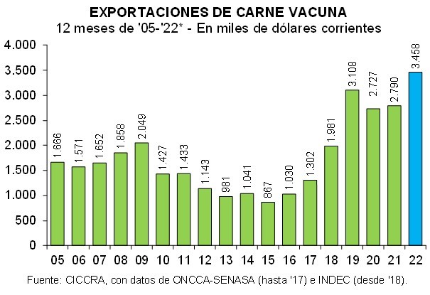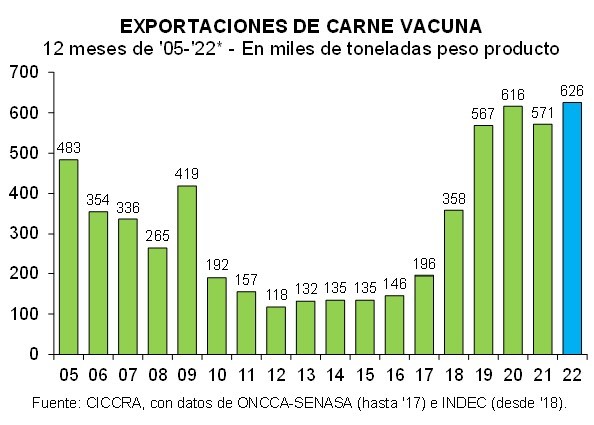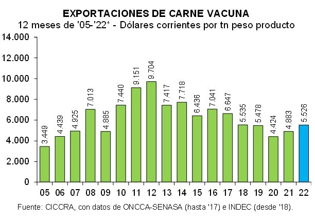 En 2022 las exportaciones certificadas de carne vacuna ascendieron a 625,7 mil tn pp. En relación a 2021 se observó un aumento de 9,5%, producto de la baja base de comparación que provocaron las restricciones adoptadas por el gobierno nacional respecto a las ventas de cortes de vaca a China. El volumen total equivalió a 899,3 mil tn r/c/h en 2022 +11,9% anual;. Por su parte, la facturación total fue de 3.457,6 millones de dólares y experimentó un incremento de 24,0% anual (+668,1 millones de dólares). En lo que respecta al precio promedio declarado, cabe señalar que a pesar de la gran caída que viene exhibiendo desde abril último, en 2022 se ubicó en 5.526 dólares por tn pp y todavía resultó 13,2% mayor al de 2021.