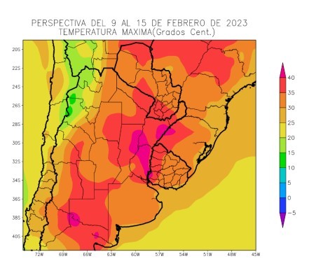 • El este del NOA, la mayor parte de Cuyo, el norte de la Mesopotamia, el noroeste y el sudeste de la Región Pampeana, la mayor parte del Paraguay y gran parte del Uruguay registrarán temperaturas máximas superiores a 30°C, observándose varios focos con valores superiores a 35 y 40°C.